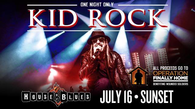 Kid Rock is coming to the House of Blues - Sunset Strip on Wednesday, July 16th to benefit Operation Finally Home which supports wounded soldiers. ALL proceeds go to the organization. Fan club pre-sale begins Wednesday, 5/21 at 10AM. A limited number of tickets will also be released to the general public on Friday. See more details here: ...